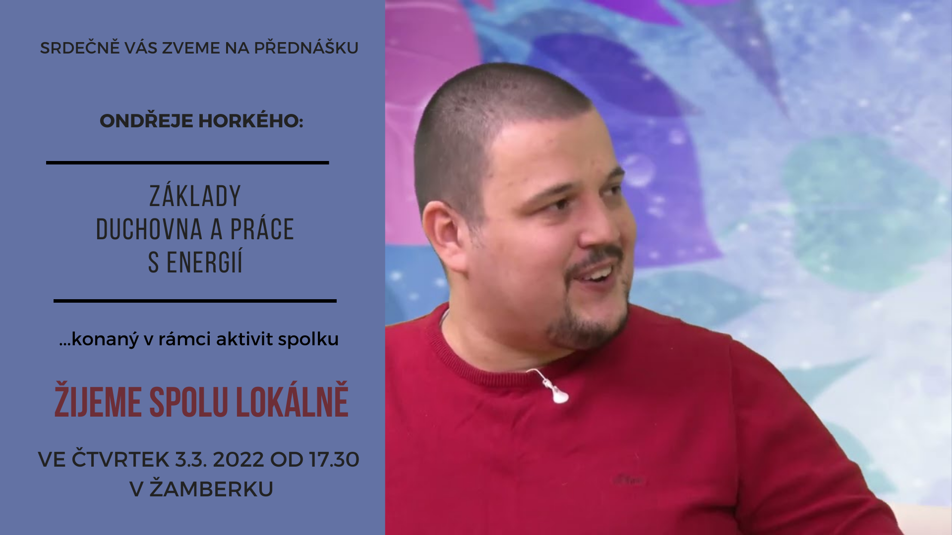 Ve čtvrtek 3. března 2022 v 17.30 přijme pozvání Ondřej horký (možná znáte z pořadu Cesty k sobě), jenž je v kontaktu se světem, který běžně nevnímáme. Přednáška na téma: "Základy duchovna a práce s energií". Více info níže/ po rozkliknutí obrázku nebo zde.